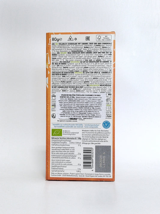 Vivani - Bio mlečna čokolada s karamelo in inka sončno soljo, 80g