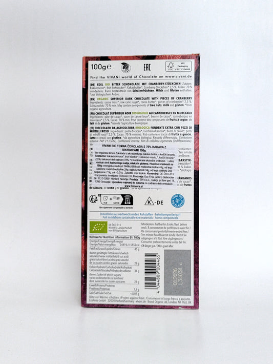 Vivani - Bio temna čokolada s 70% kakava, z brusnicami, 100g