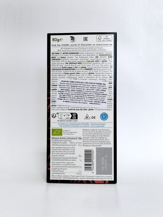Vivani - Bio temna čokolada z 99% kakava Panama 80g