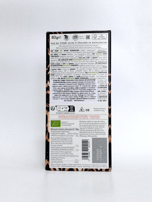 Vivani - Bio temna čokolada z 92% kakava in s kokosovim sladkorjem 80g