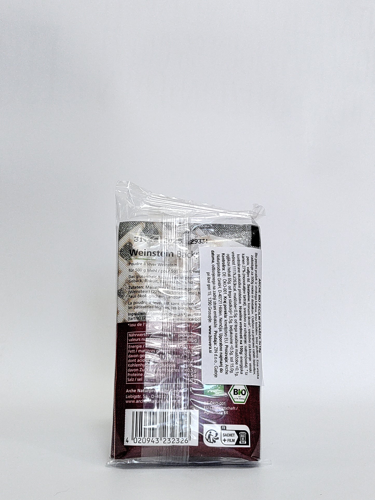 Bio pecilni prašek iz vinskega kamna, brez fosfatov, brez glutena. Ena vrečka zadostuje za 500g moke in dodatkov. Odličen za pripravo rahlih biskvitov, peciv, vafljev itd.