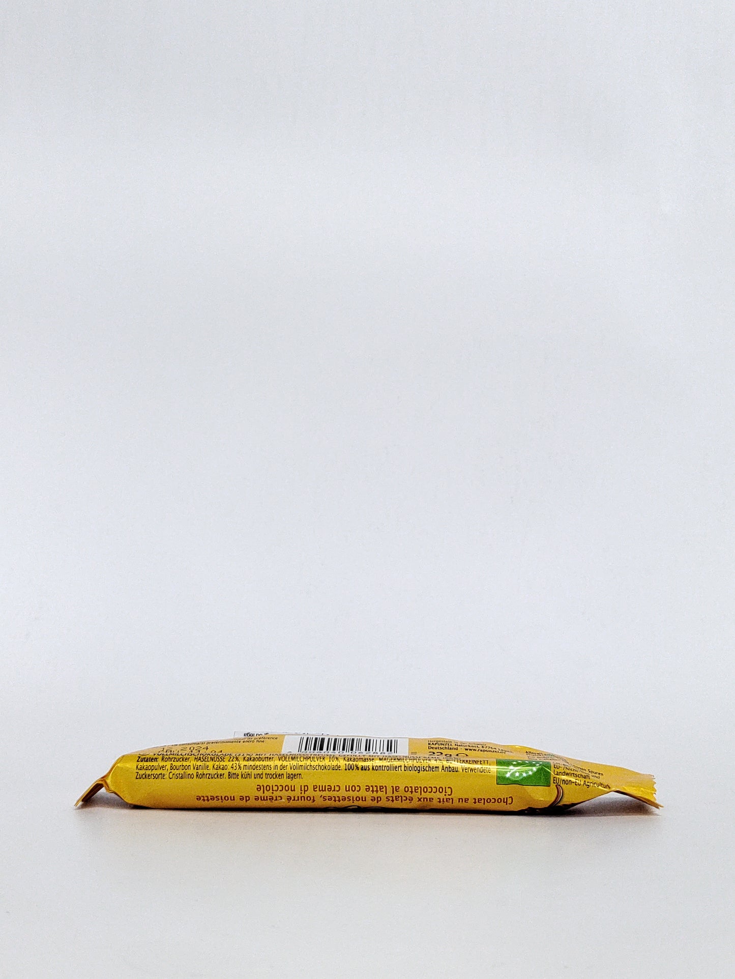Bio palčka iz mlečne čokolade (31 %) z drobljenimi lešniki in lešnikovim polnilom (66 %).