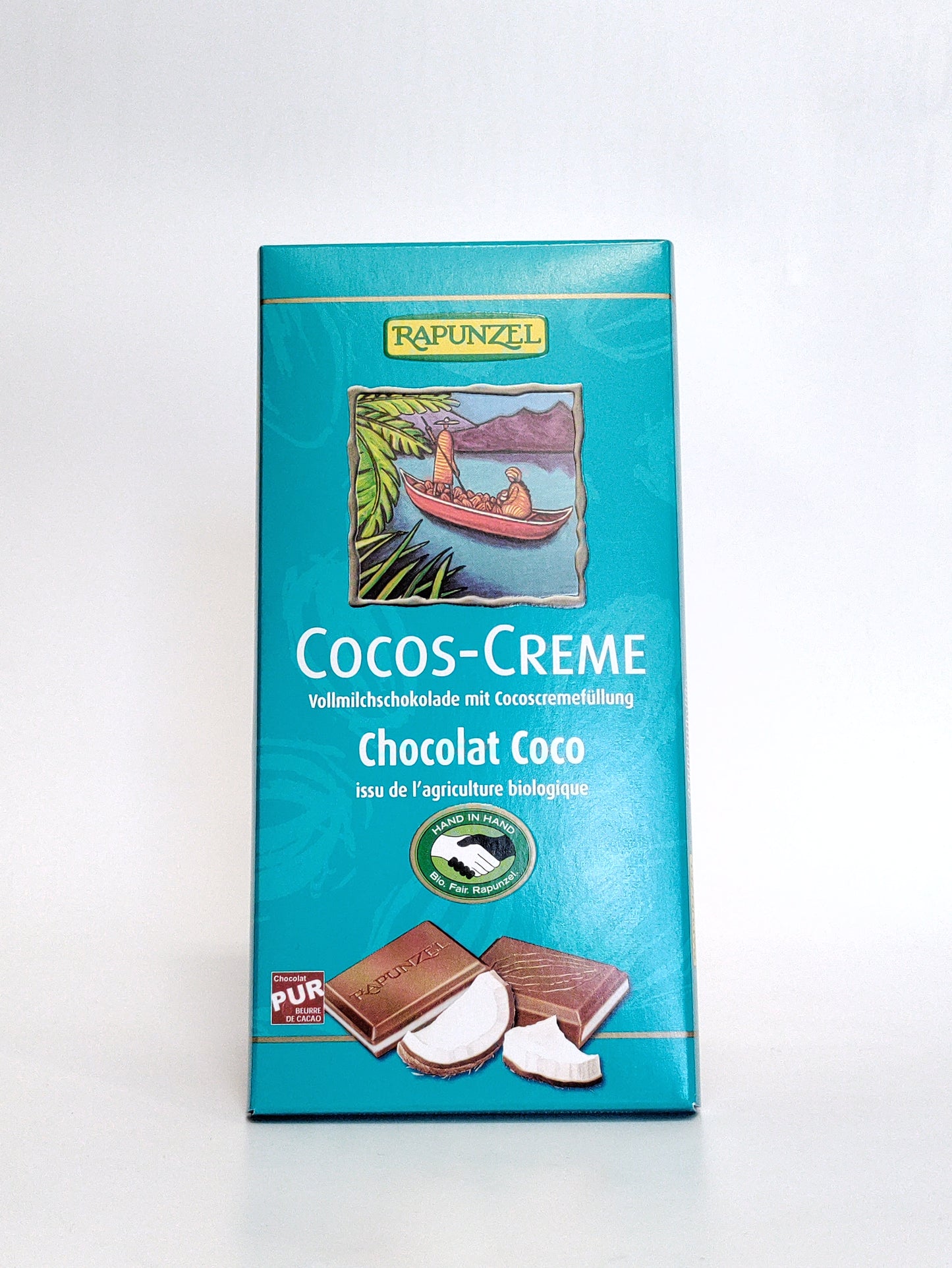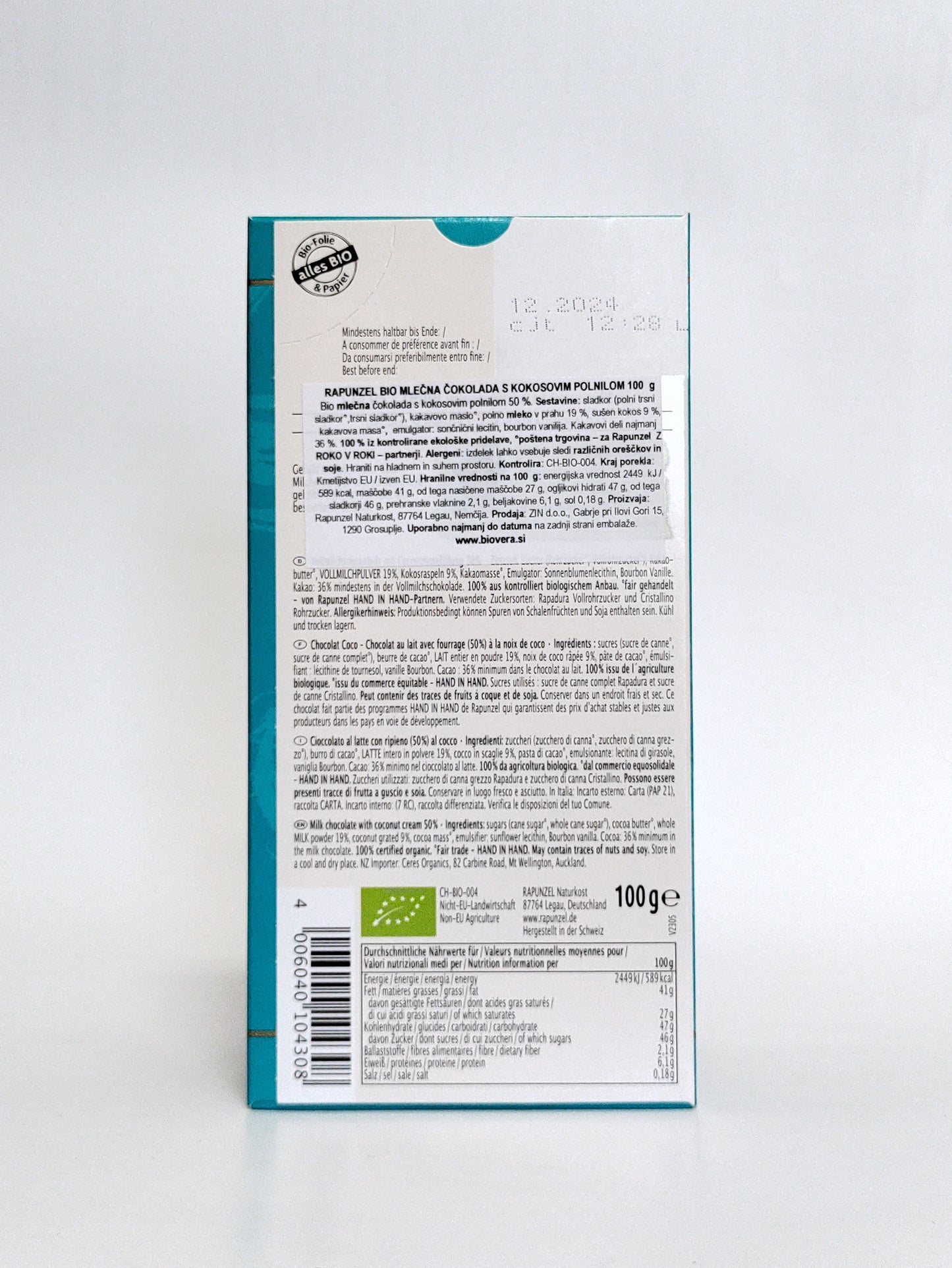 Sestavine: sladkor (polni trsni sladkor°,trsni sladkor°), kakavovo maslo°, polno mleko v prahu 19 %, sušen kokos 9 %, kakavova masa°, emulgator: sončnični lecitin, bourbon vanilija. Kakavovi deli najmanj 36 %. 100 % iz kontrolirane ekološke pridelave, °poštena trgovina – za Rapunzel Z ROKO V ROKI – partnerji.