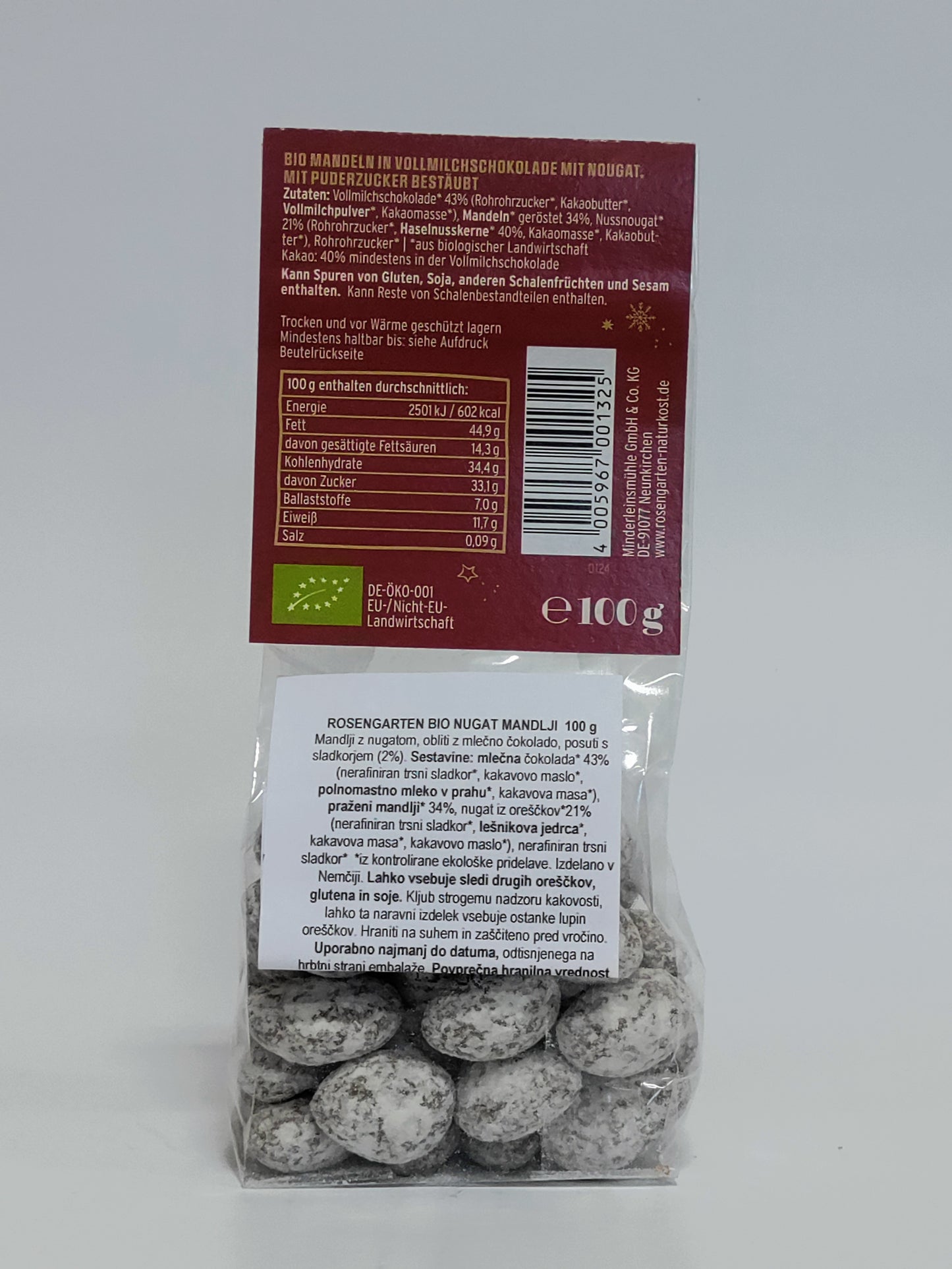 Sestavine: mlečna čokolada* 43% (nerafiniran trsni sladkor*, kakavovo maslo*, polnomastno mleko v prahu*, kakavova masa*), praženi mandlji* 34%, nugat iz oreščkov*21% (nerafiniran trsni sladkor*, lešnikova jedrca*, kakavova masa*, kakavovo maslo*), nerafiniran trsni sladkor* *iz kontrolirane ekološke pridelave. Izdelano v Nemčiji. Lahko vsebuje sledi drugih oreščkov, glutena in soje. Kljub strogemu nadzoru kakovosti, lahko ta naravni izdelek vsebuje ostanke lupin oreščkov. Hraniti na suhem in zaščiteno pred vročino.